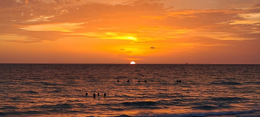 Sunset from the sailboat Minutes later, our feast was ready. As we ate, dolphins swam by about 6 feet behind the stern and then down the starboard side. It was the most untraditional Thanksgiving.