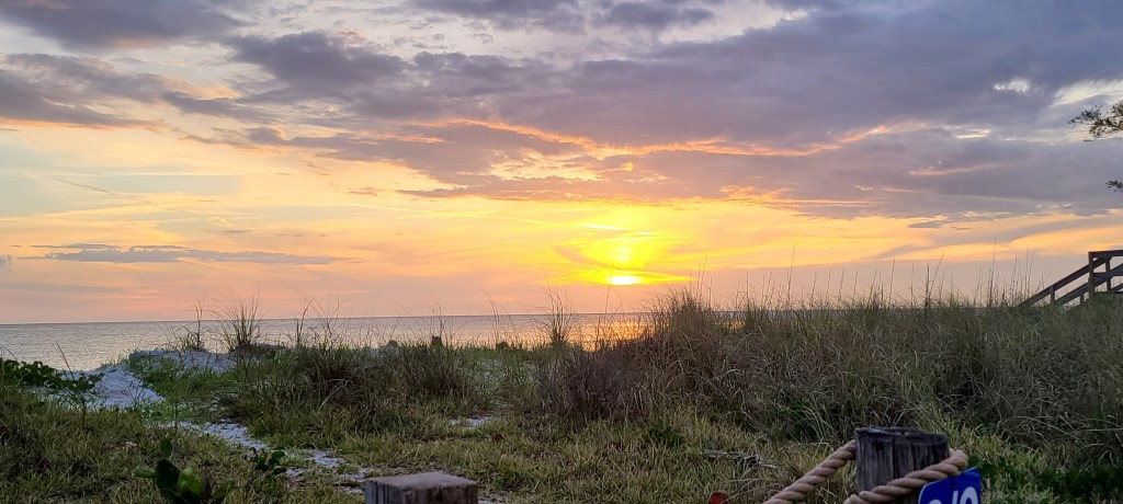 Sea grape leaves and sea oats view of the sunset Luckily, we stood behind the row of sea grape trees that line the north side of the bridge. The trees provide protection from the cold northern winds.